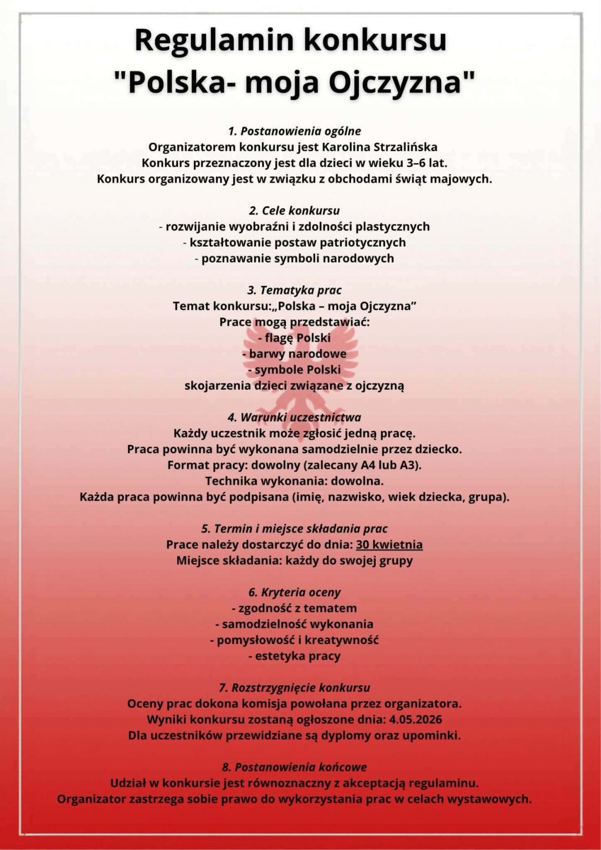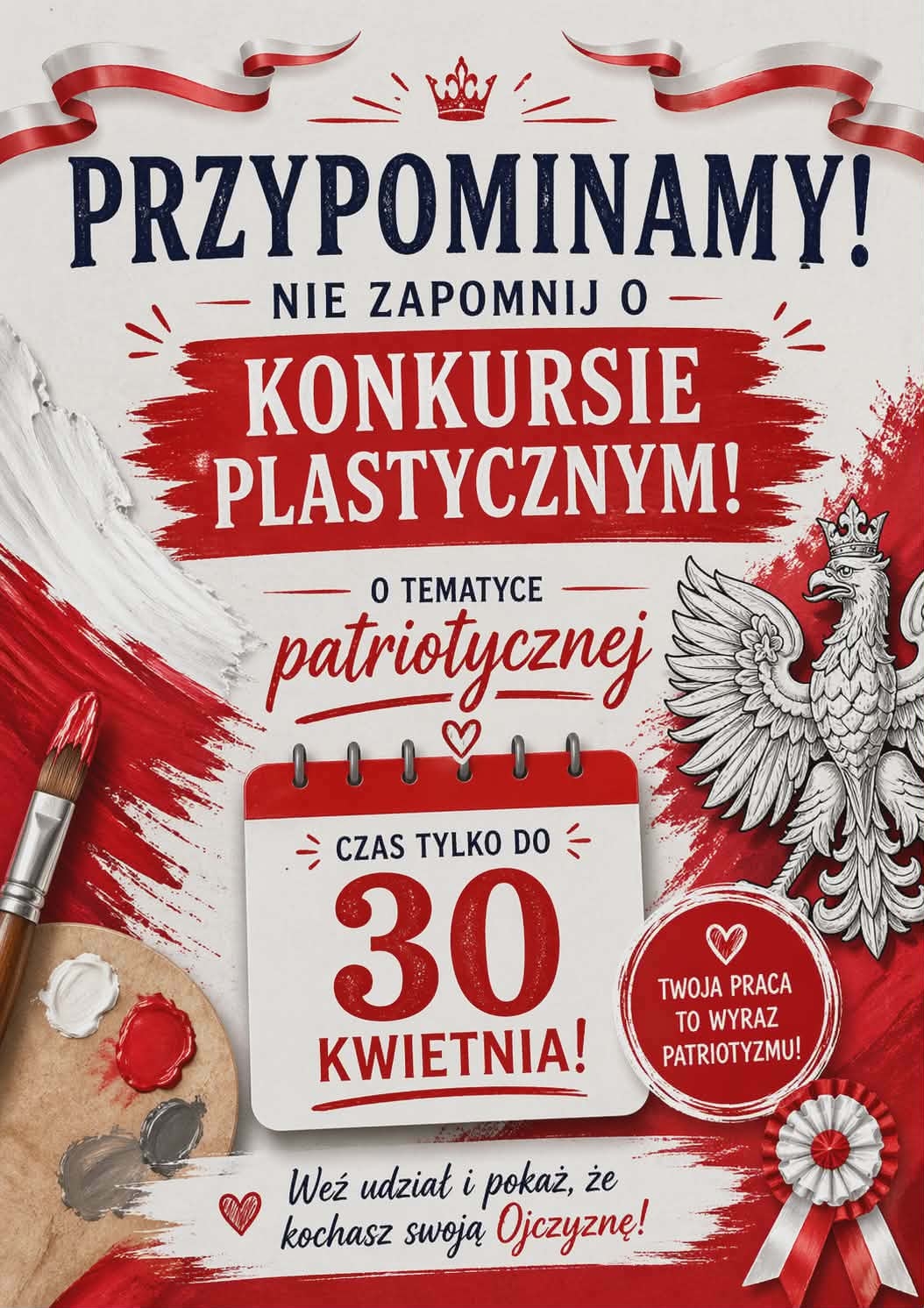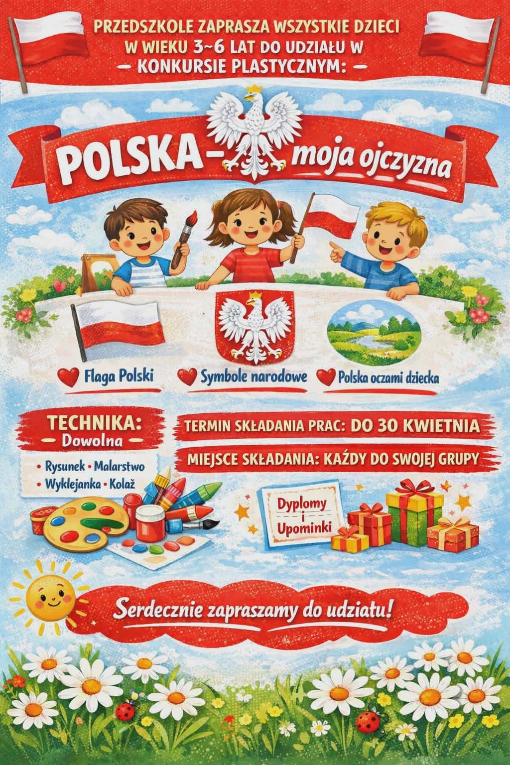 Serdecznie zachęcamy wszystkie dzieci wraz z rodzicami do wzięcia udziału w przedszkolnym konkursie plastycznym o tematyce patriotycznej. To doskonała okazja, aby poprzez twórczą zabawę porozmawiać z dziećmi o ważnych wartościach takich jak miłość do Ojczyzny, szacunek do symboli narodowych oraz znaczenie Konstytucji 3 Maja. Udział w konkursie to nie tylko rozwijanie kreatywności, ale również piękny moment do budowania i wzmacniania postaw patriotycznych już od najmłodszych lat. Zachęcamy do wspólnego tworzenia i odkrywania historii naszej Ojczyzny.