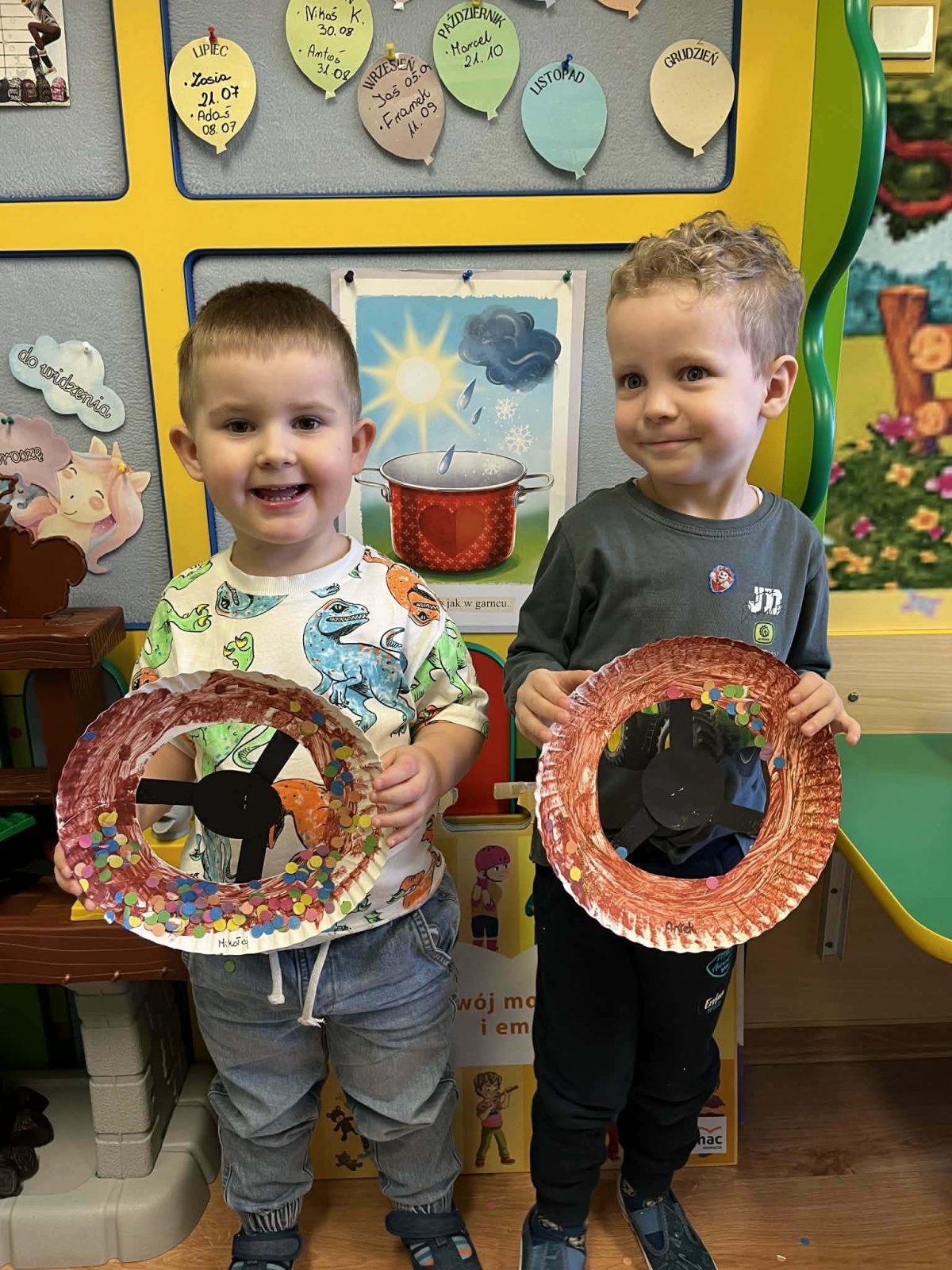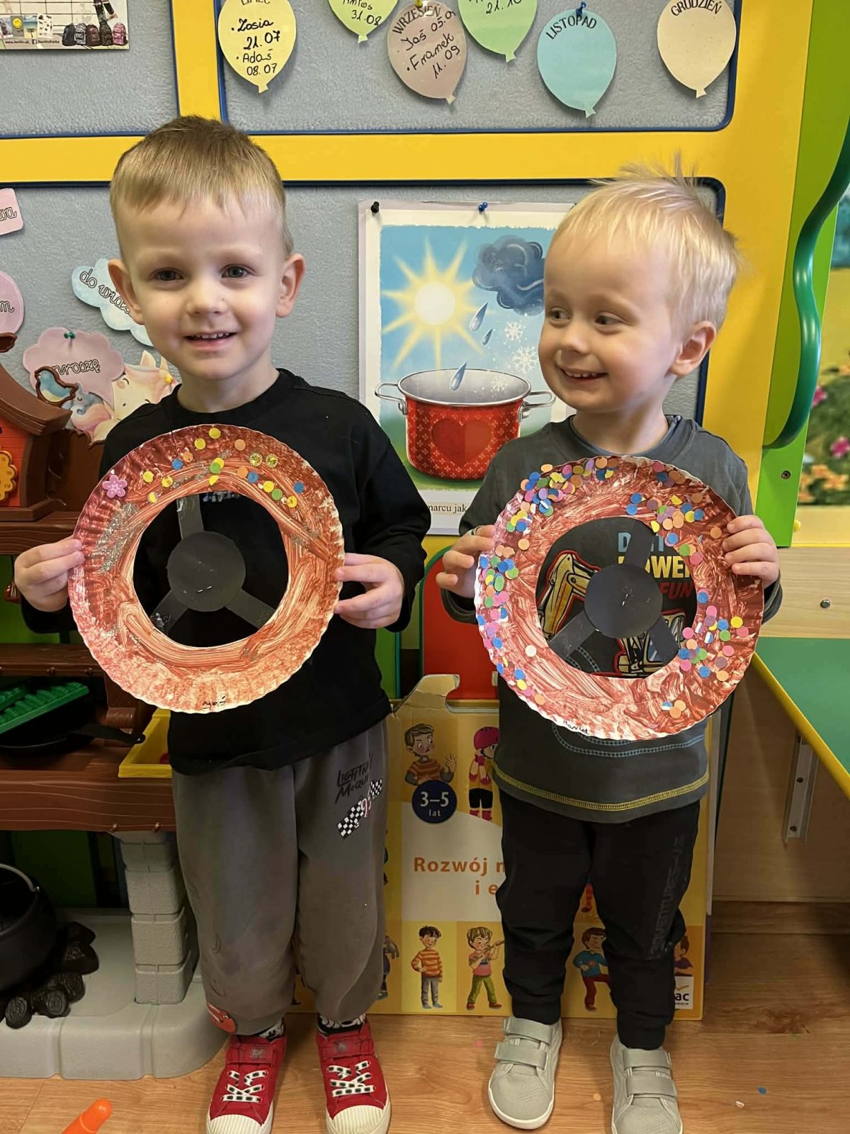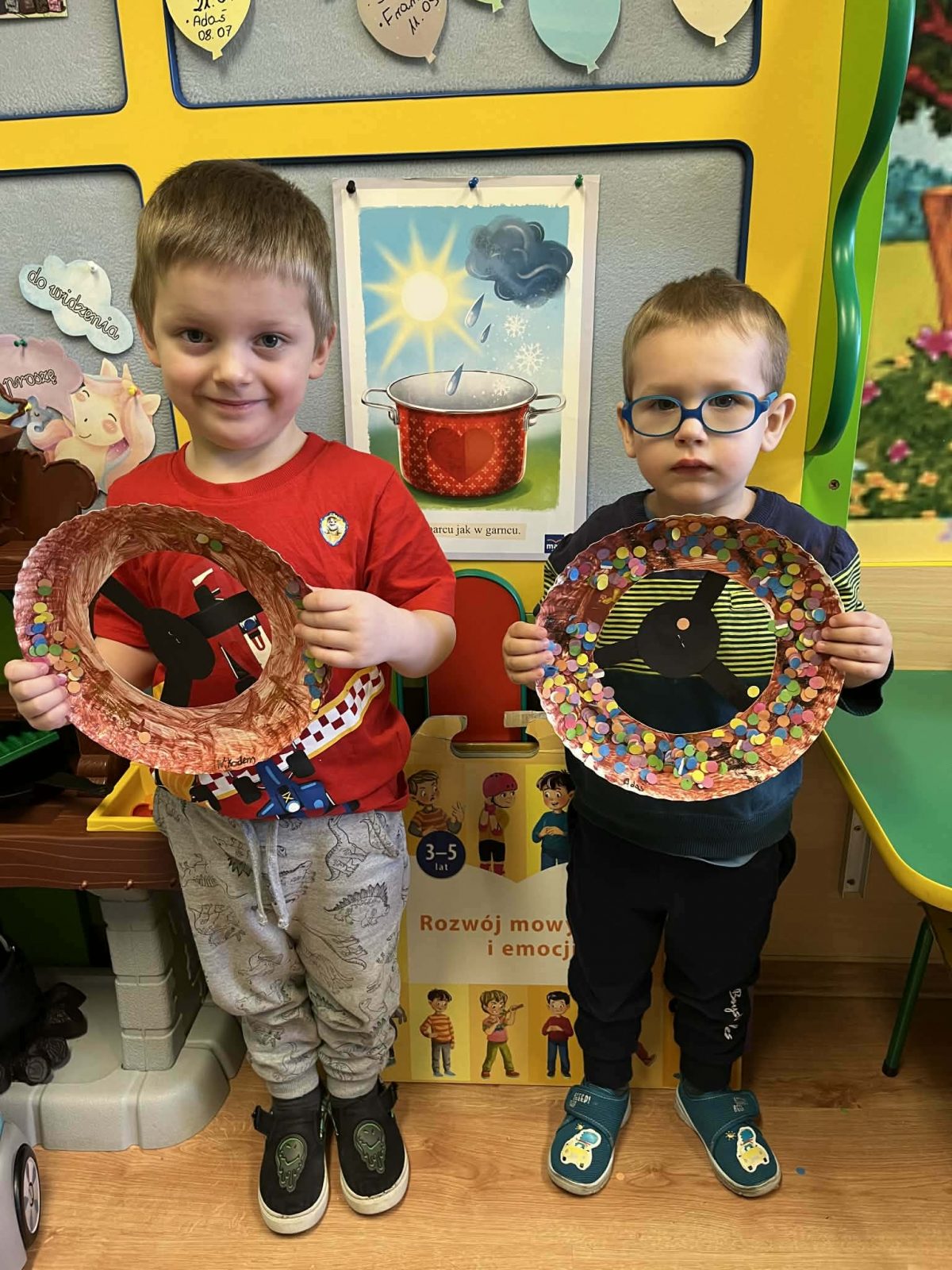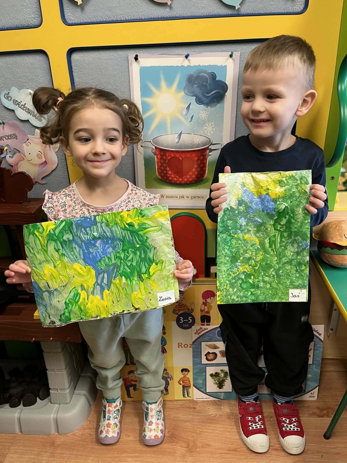 Rozmawialiśmy o powiedzeniu „W marcu jak w garncu”. Dzieci ugotowały marcową zupę pogodową i poznały różne zjawiska atmosferyczne, które mogą pojawić się w tym miesiącu. Rozpoczęliśmy także prowadzenie tygodniowego planu pogody, który dzieci będą wspólnie uzupełniać każdego dnia, obserwując jaka aura towarzyszy nam za oknem.