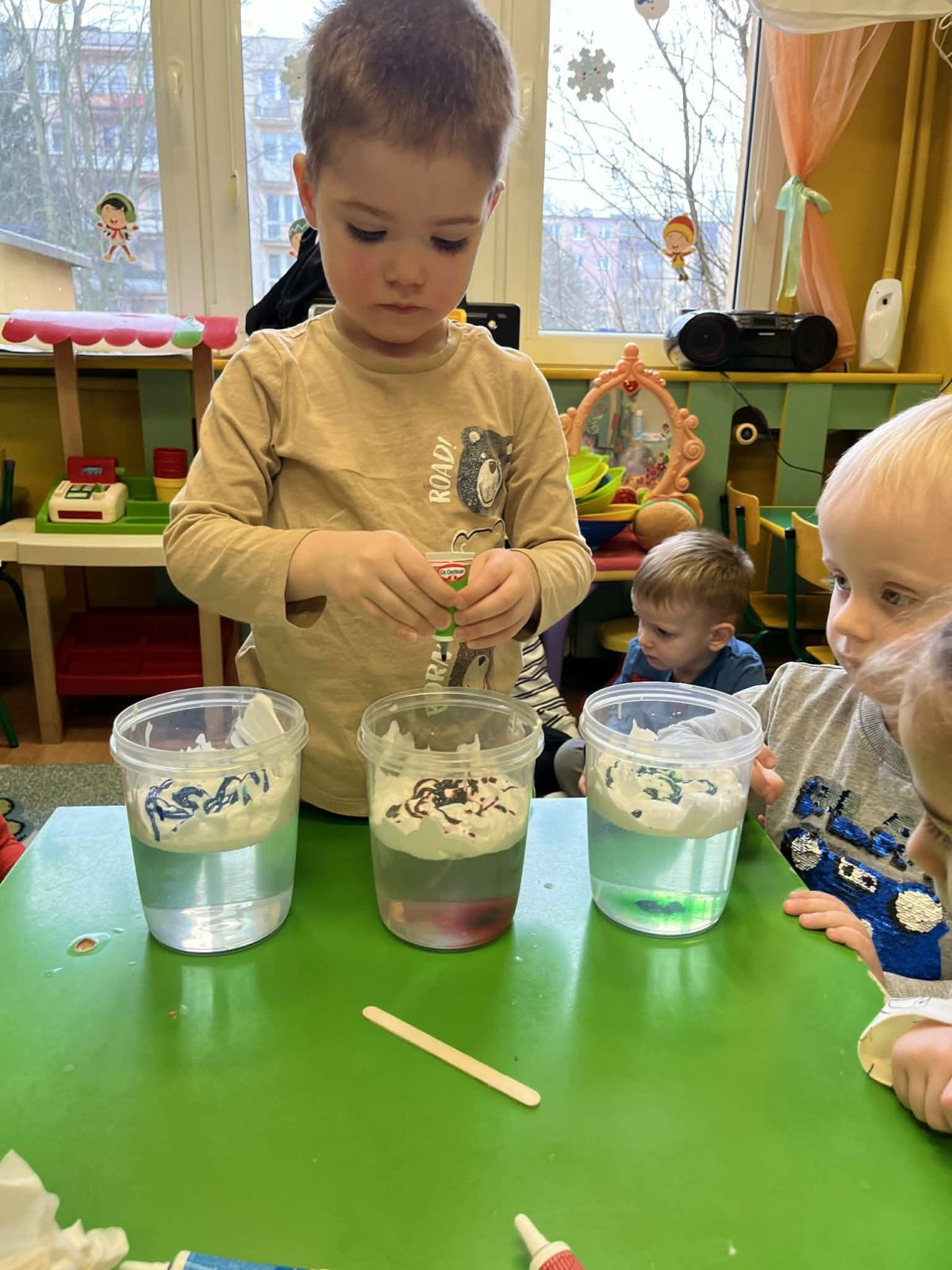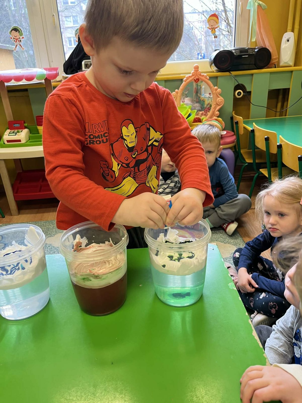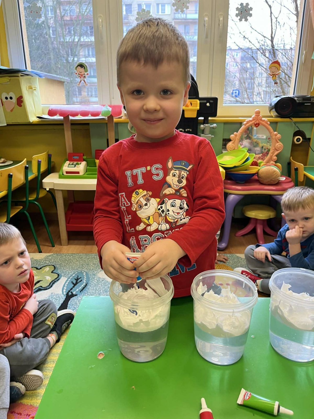 Rozmawialiśmy o powiedzeniu „W marcu jak w garncu”. Dzieci ugotowały marcową zupę pogodową i poznały różne zjawiska atmosferyczne, które mogą pojawić się w tym miesiącu. Rozpoczęliśmy także prowadzenie tygodniowego planu pogody, który dzieci będą wspólnie uzupełniać każdego dnia, obserwując jaka aura towarzyszy nam za oknem.