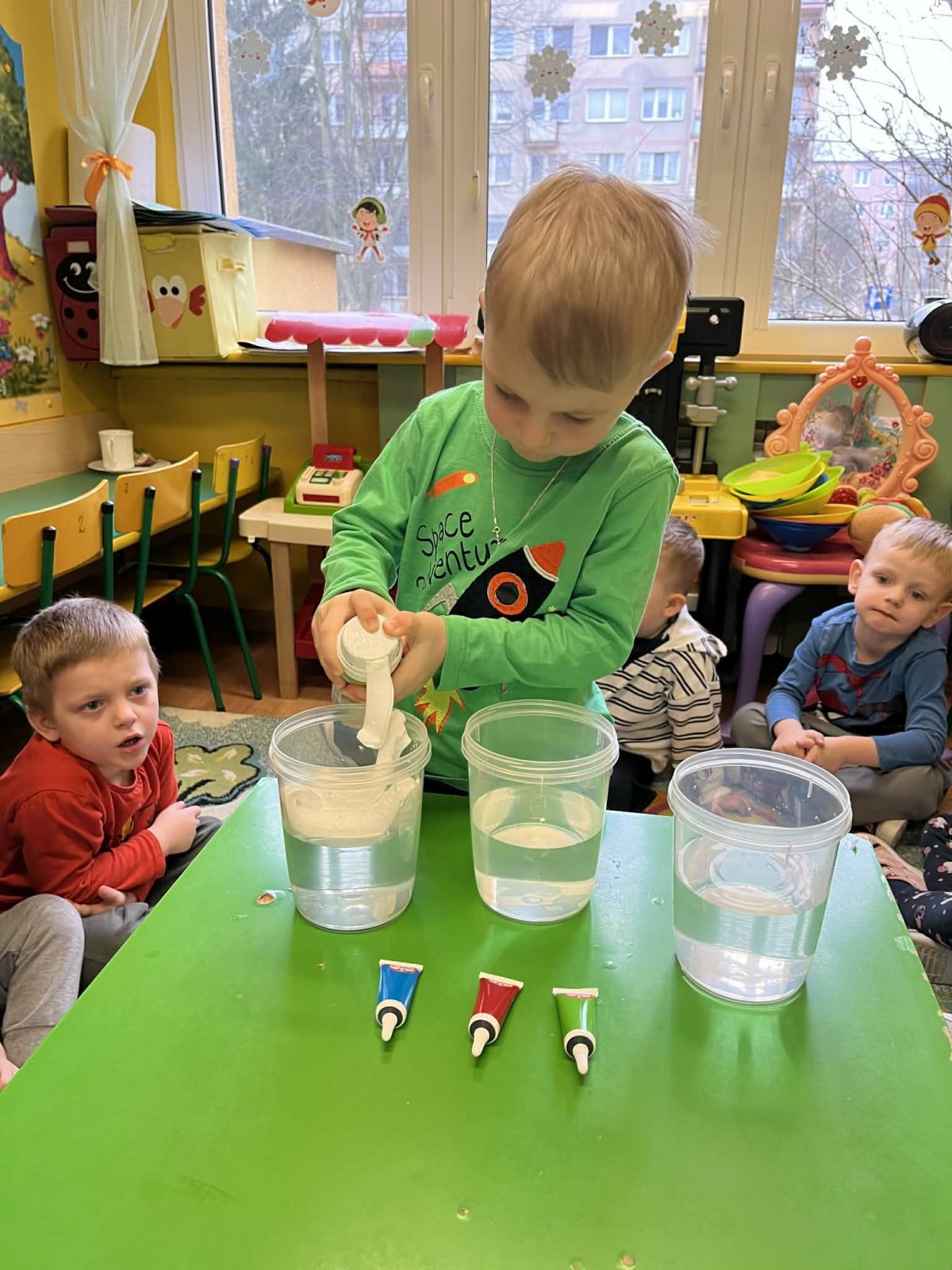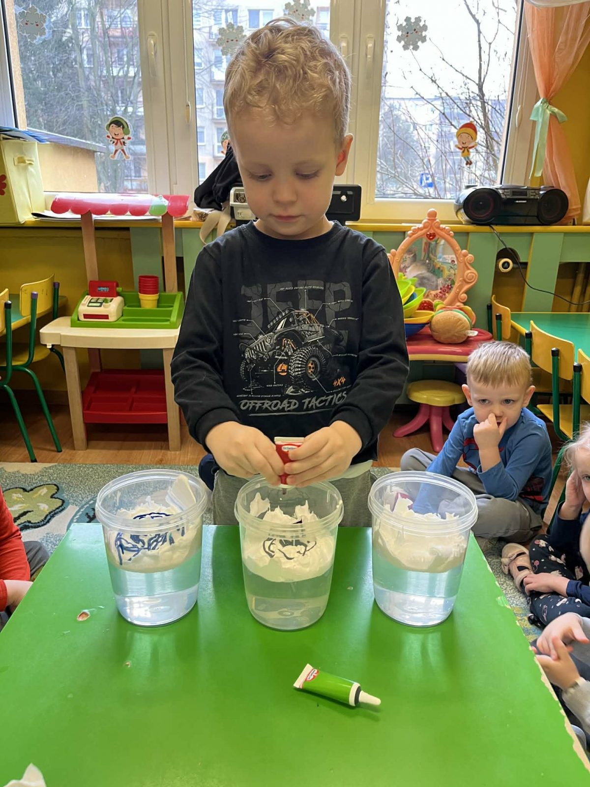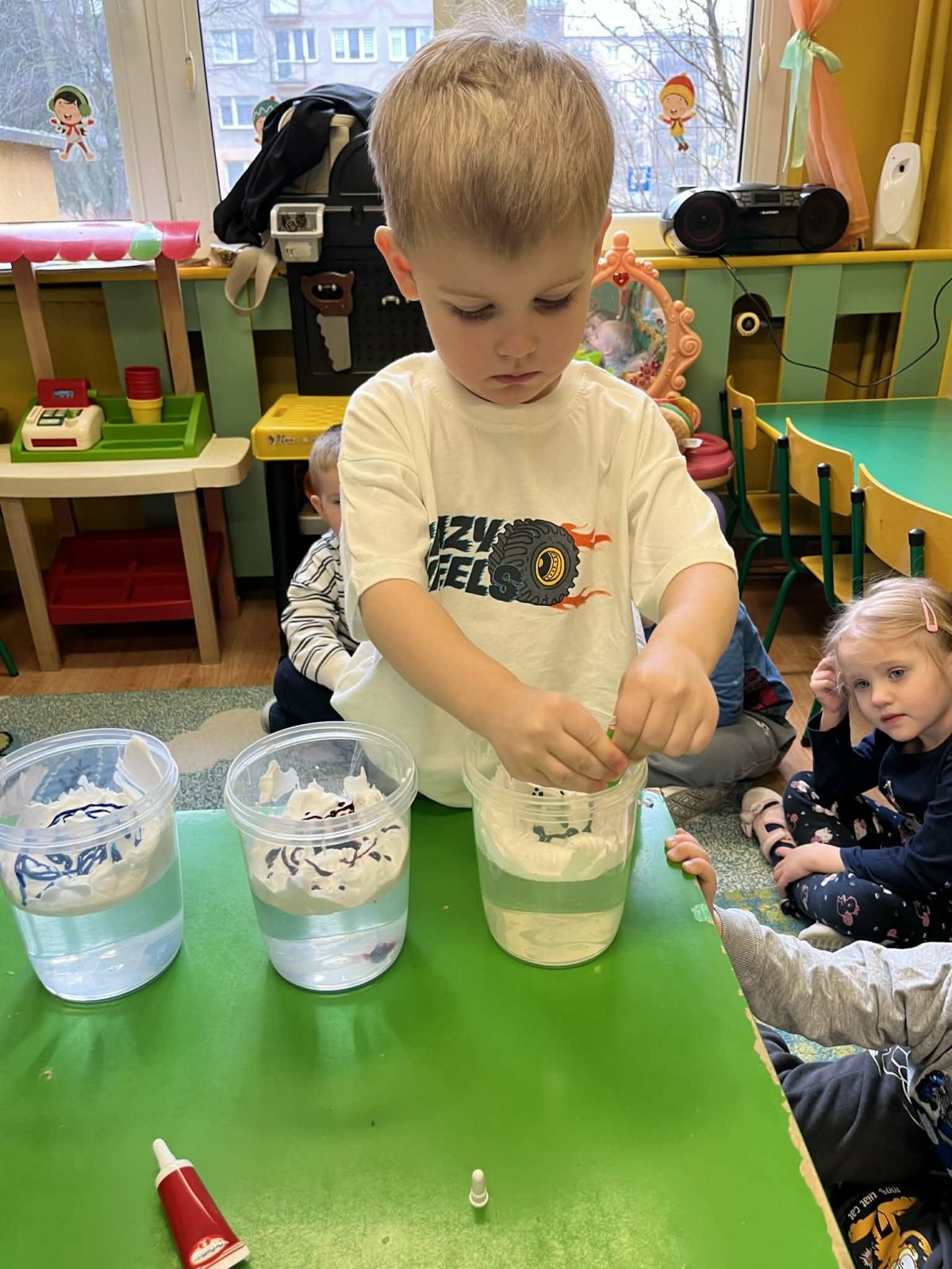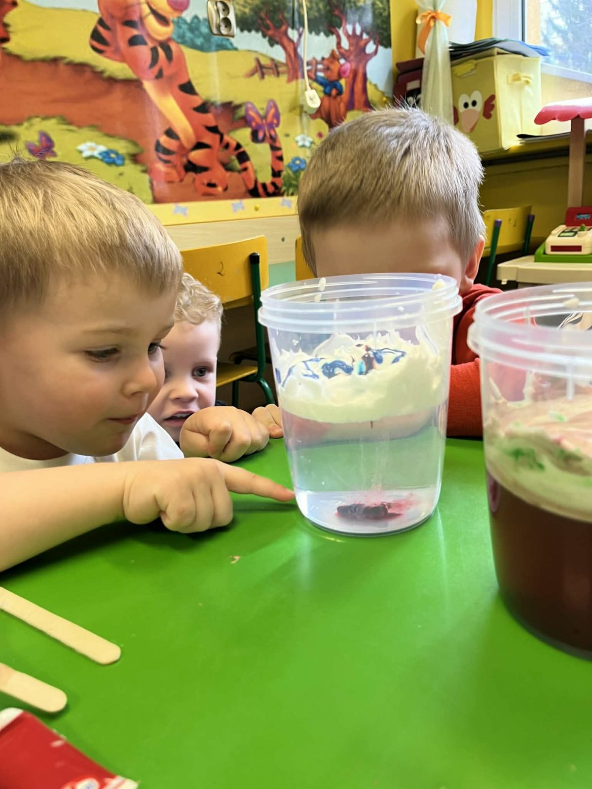 Rozmawialiśmy o powiedzeniu „W marcu jak w garncu”. Dzieci ugotowały marcową zupę pogodową i poznały różne zjawiska atmosferyczne, które mogą pojawić się w tym miesiącu. Rozpoczęliśmy także prowadzenie tygodniowego planu pogody, który dzieci będą wspólnie uzupełniać każdego dnia, obserwując jaka aura towarzyszy nam za oknem.